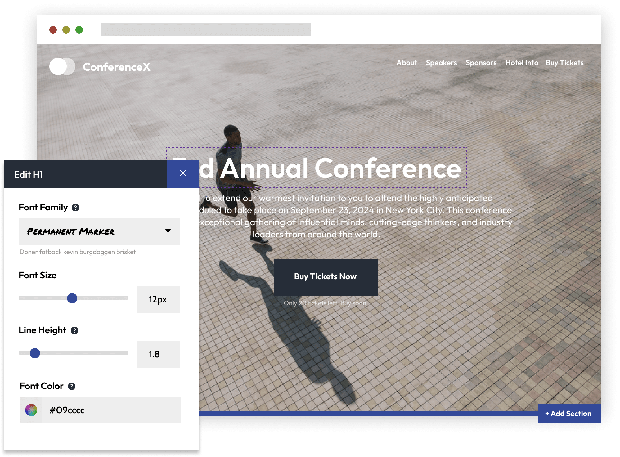 Get started by choosing one of EventCreate's event website themes, each handcrafted by our award winning design team. From there you can quickly add content, import images or videos, customize your fonts, and modify the design to make the website your own. And don't worry. No coding skills are required and no server setup is needed.