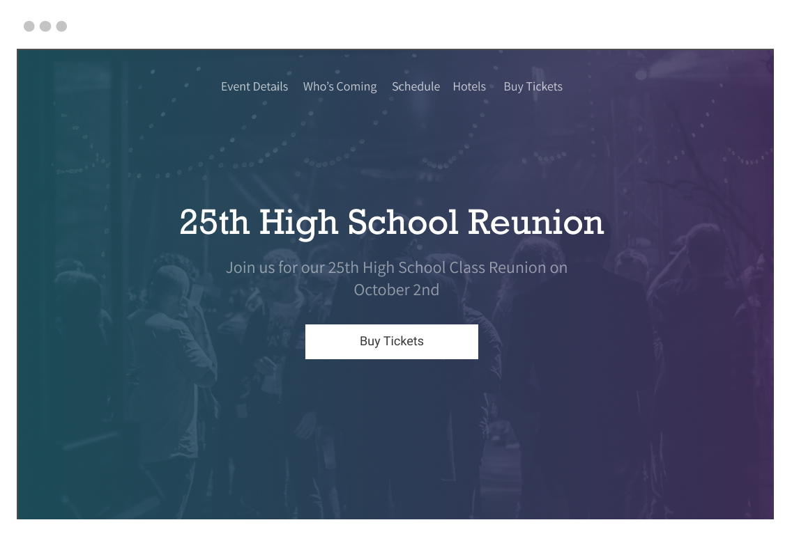 Planning a school or family reunion can be daunting, which is why we makes it unbelievably easy to create a impressive reunion website. With EventCreate, you can build a custom reunion website using our website builder, complete with event details, photo galleries an an interactive attendee list. Ticketing and event registration is built-in so you can easily collect payment and registrations online.